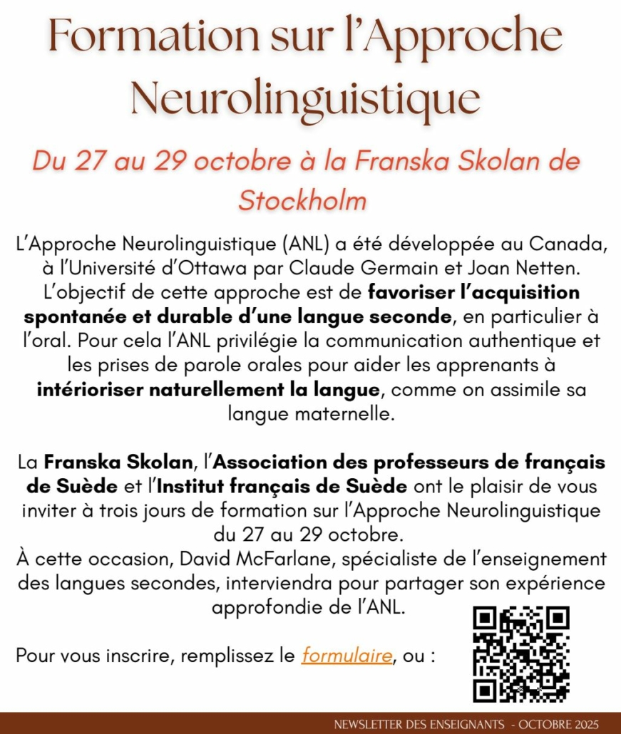 La Franska Skolan, l’Association des professeurs de français de Suède et l’Institut français de Suède ont le plaisir de vous inviter à trois jours de formation sur l’Approche Neurolinguistique du 27 au 29 octobre.
