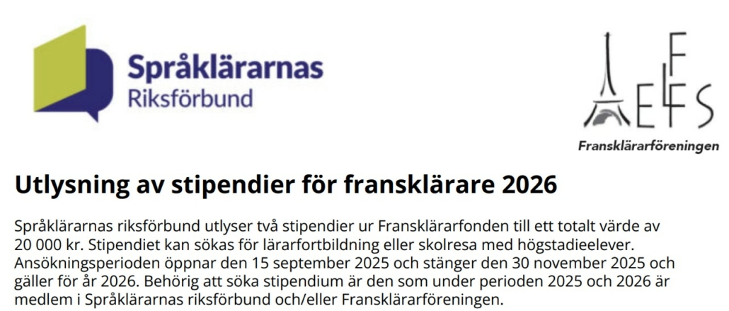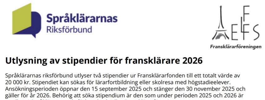 2019 emottog Språklärarnas riksförbund en donation från Sverige-Frankrikestiftelsen i samband med att stiftelsen avvecklade sin verksamhet. Pengarna finns på ett särskilt konto hos Språklärarnas riksförbund och är vikta för stipendier till fransklärare och skolklasser i högstadiet. Stipendiepengarna förvaltas av Språklärarnas riksförbund och kommer att delas ut årligen tills medlen är slut. Eftersom Sverige-Frankrikestiftelsen hade nära band med Fransklärarföreningen har Språklärarnas riksförbund beslutat att medlemmar i de båda föreningarna ska kunna söka dessa stipendier. Detta för att verka i stiftelsens anda och erbjuda fransklärare en möjlighet att fortbilda sig i ett målspråksland och ge högstadieelever en möjlighet att åka på skolresa till ett fransktalande land.